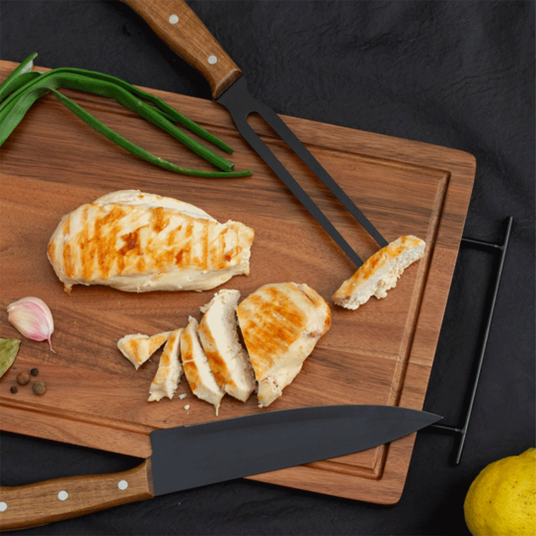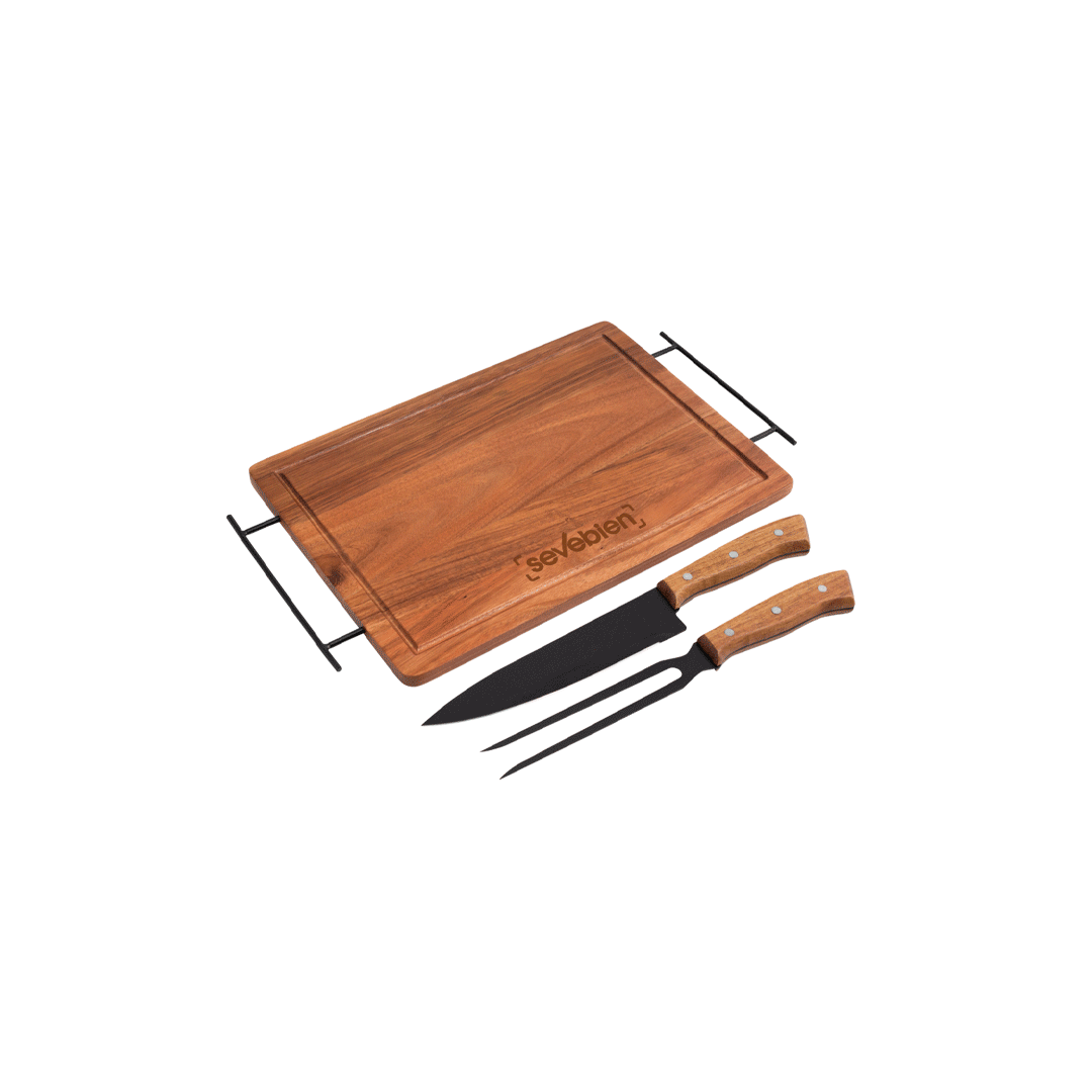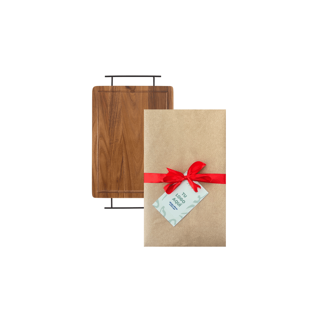 Tabla de corte o bandeja de madera de acacia con asa de ambos lados de acero de carbono. Contiene 2 utensilios de acero inoxidable 420 y mangos de madera de acacia. Tamaño 43 x 26 x 1,2 cm con logo grabado en tabla. Presentado en caja kraft envuelta en papel con cinta y tarjeta de regalo personalizada.