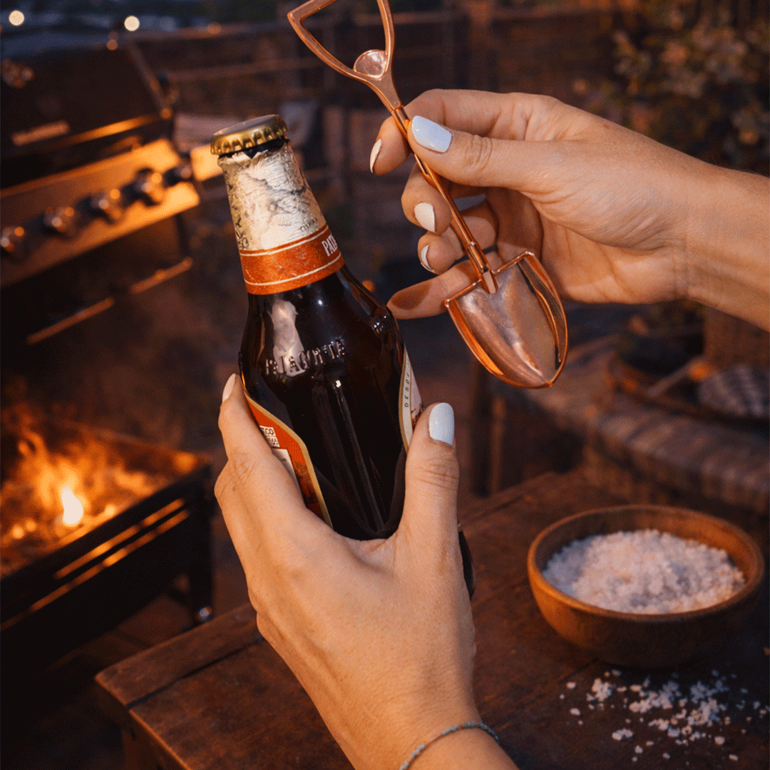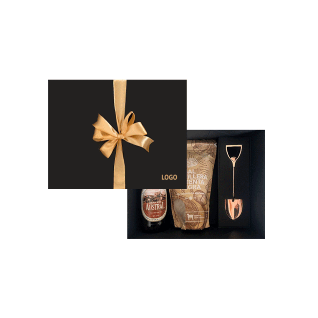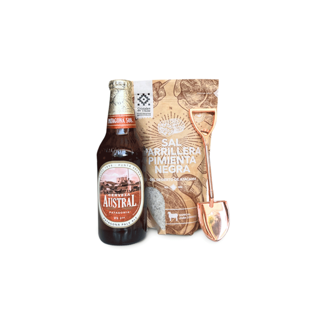 Set incluye una cerveza austral de 330cc más un destapador en forma de pala en cobre y una sal parrillera pimienta negra de 450gr. Presentado en caja premium imantada de 25,5x20cm con logo a un color y cinta a elección.