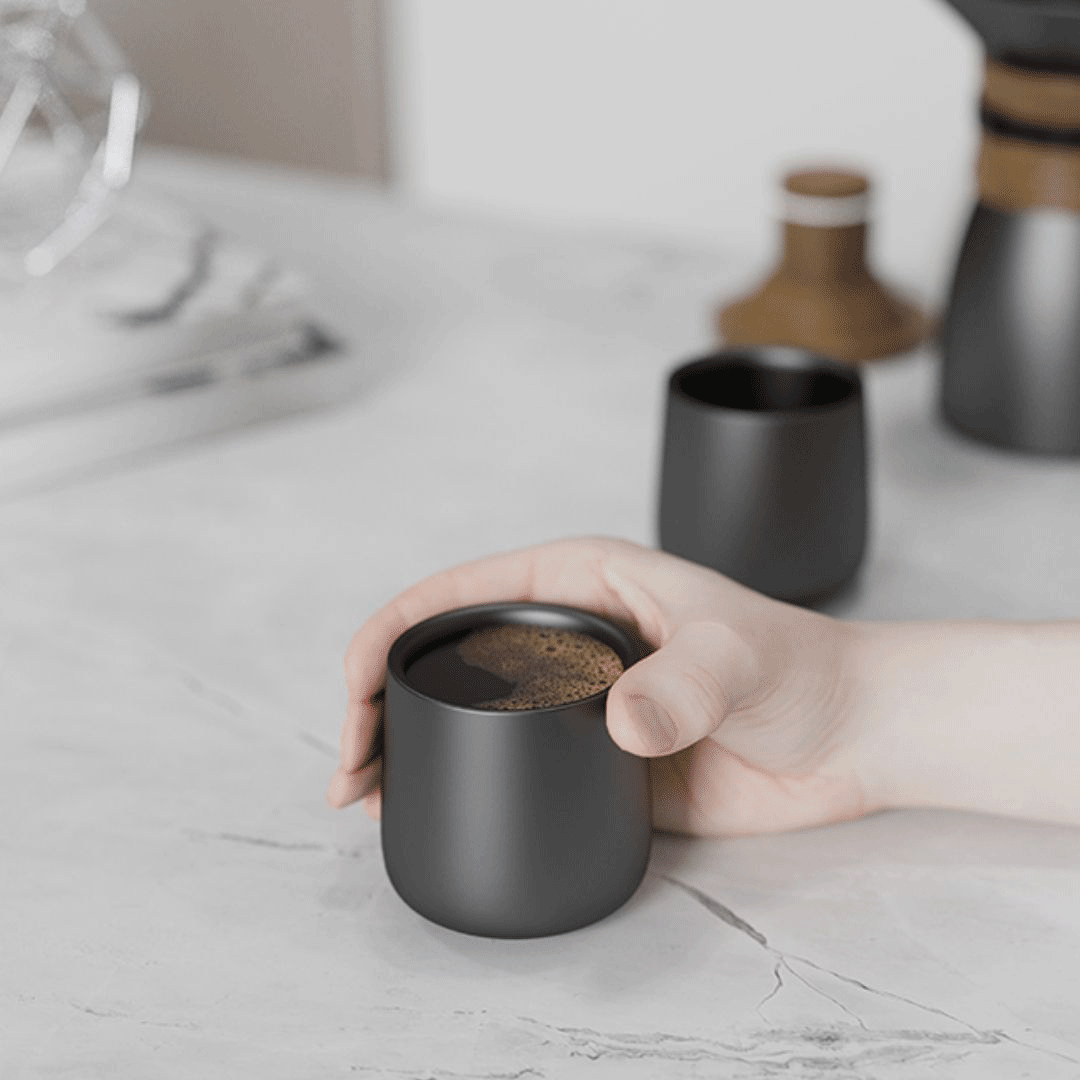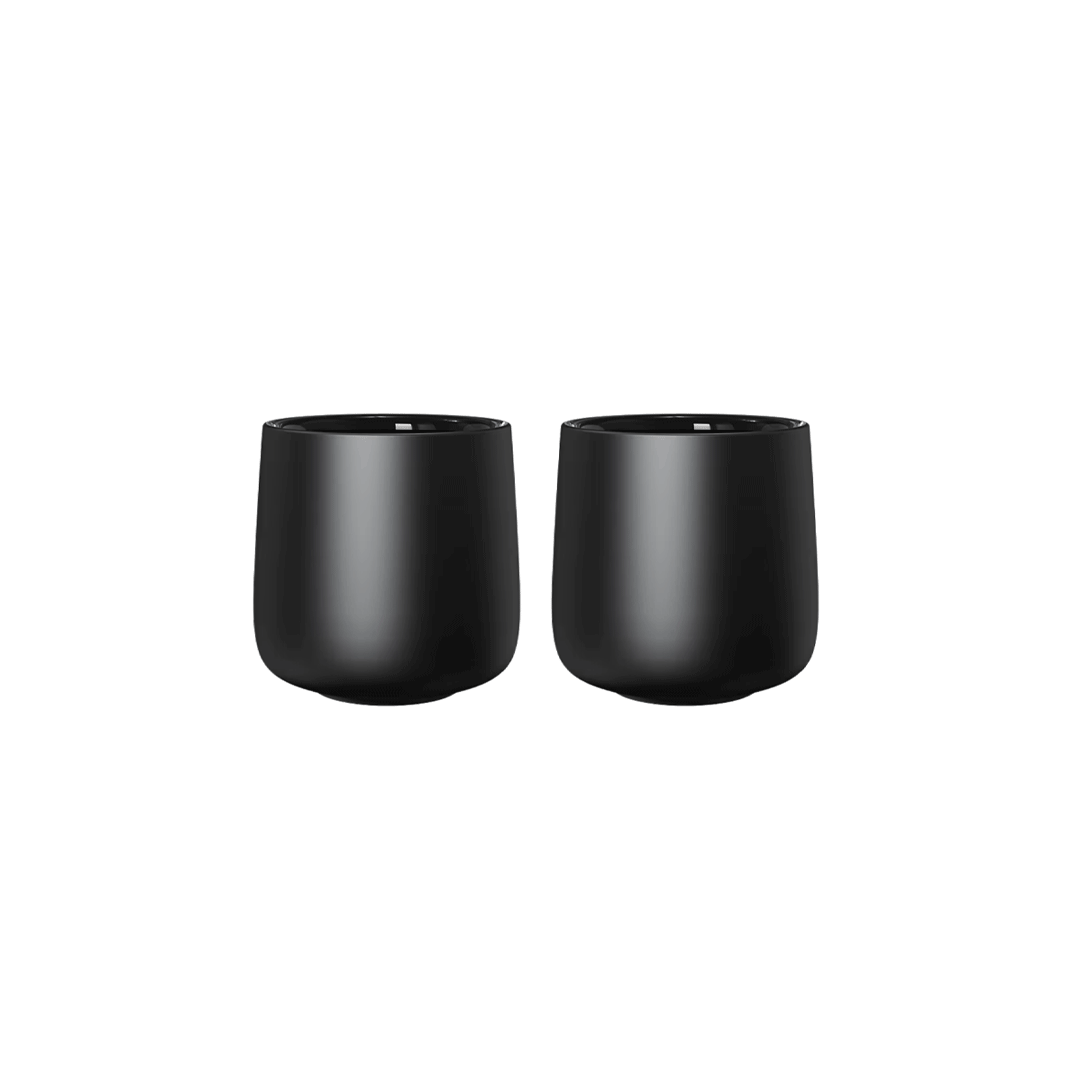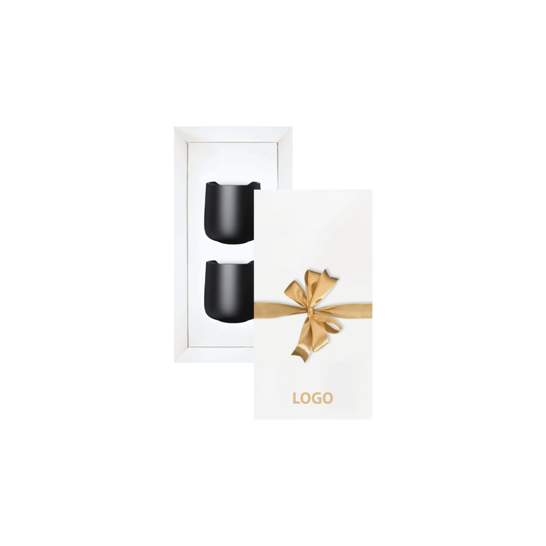 Set de 2 vasos de cerámica gres, terminación matte, de doble pared capacidad 150 ml (elección de color según stock; negro, gris y beige) diseñadas para mantener la temperatura ideal de tus bebidas y ofrecer una experiencia sofisticada en cada uso ambos con logo a 1 color. Presentado en caja premium imantada 30x14cm blanca con encajes, logo a un color y cinta a elección.
