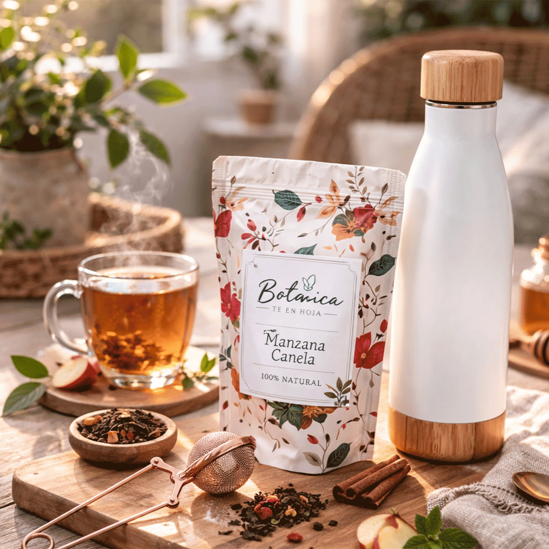 Contiene Botella térmica de doble pared de acero inoxidable y tapa de bambú, capacidad de 500 ml. Mantiene las bebidas frías por 24 hrs y calientes por 12 hrs. logo grabado laser + un doypack de hierbas con sabores variados + un infusor cobrizado tipo pinza. Presentado en caja premium con cierre imantado 30×14 cms, logo a un color y cinta a elección.