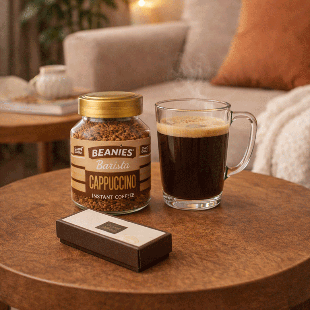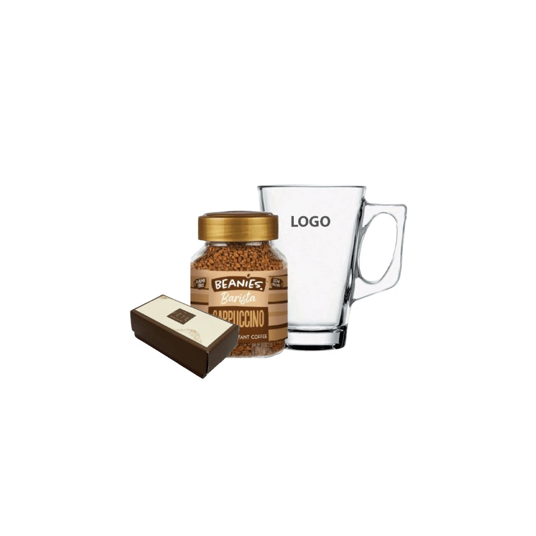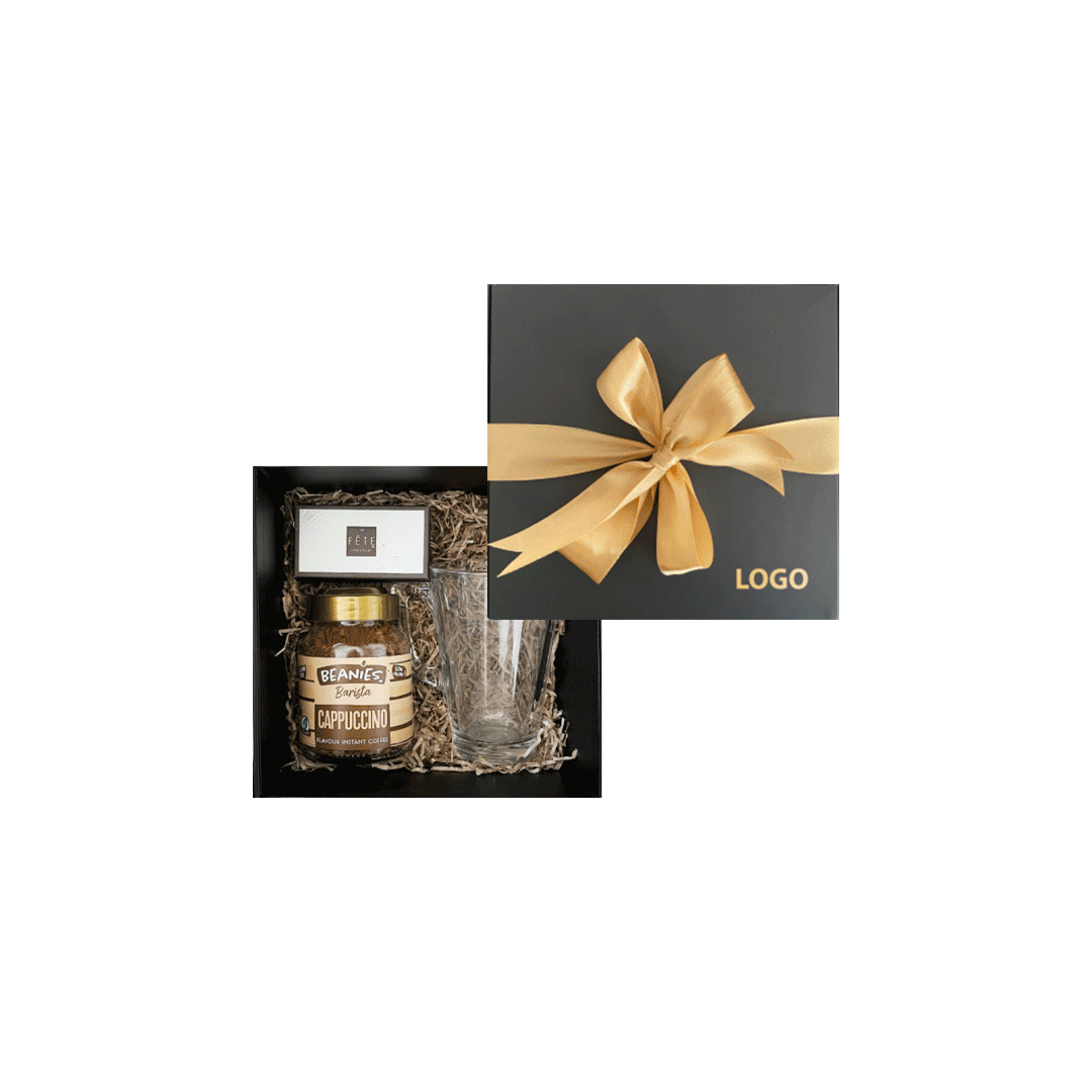 Incluye un café instantáneo saborizado de 50 gr sabores según stock, + Taza de vidrio de 125cc con logo a un color + Una caja con 2 calugas la fete. Presentado en caja negra premium imantada de 16x16cm con logo y/o grafica a un color.