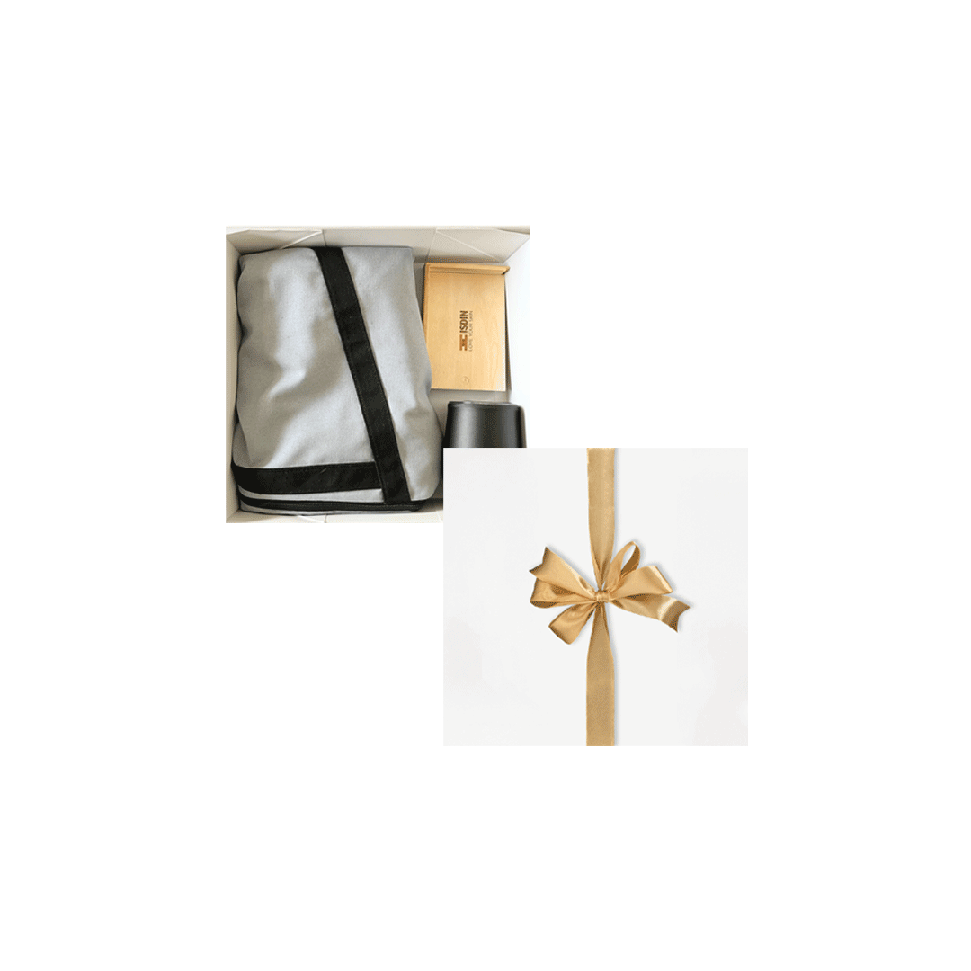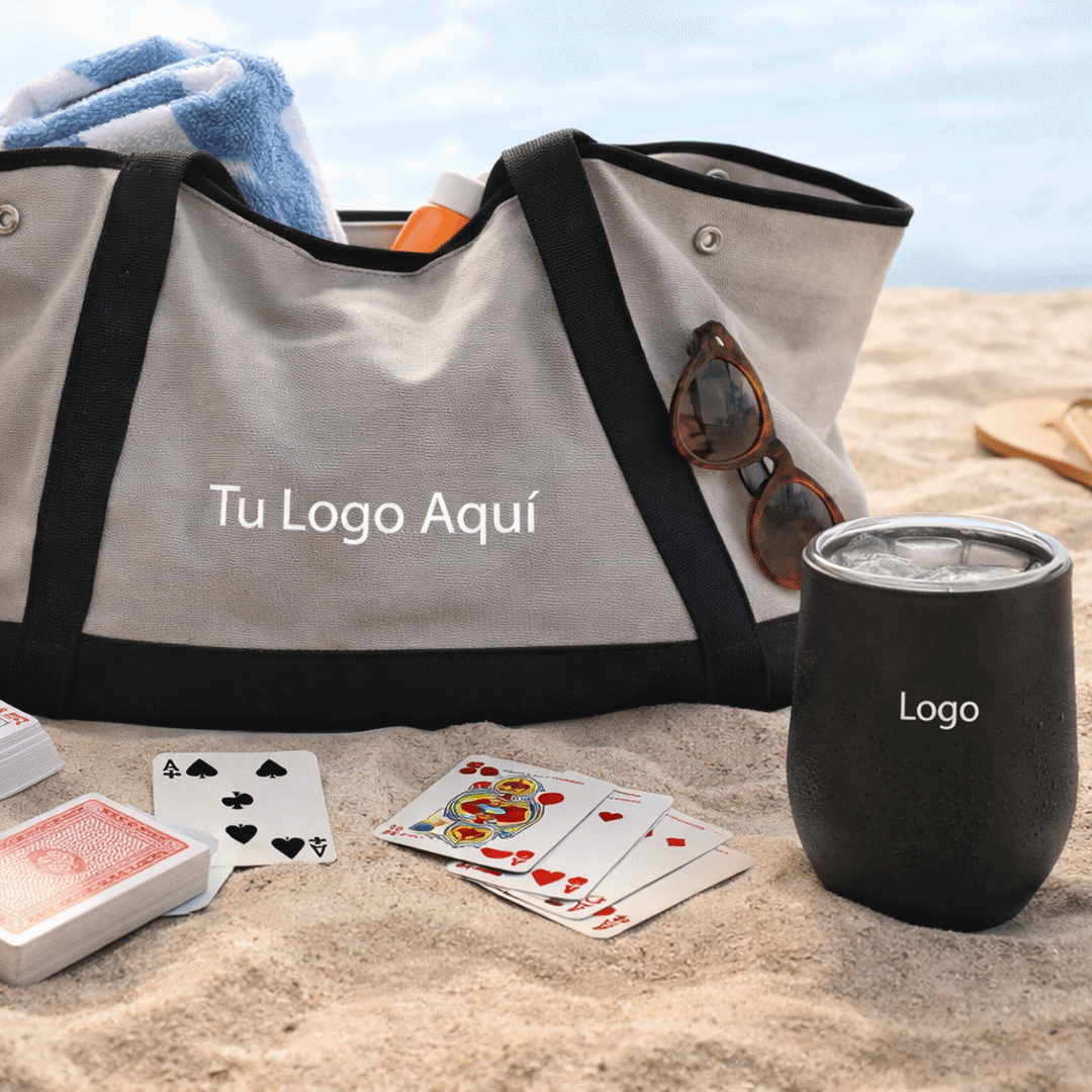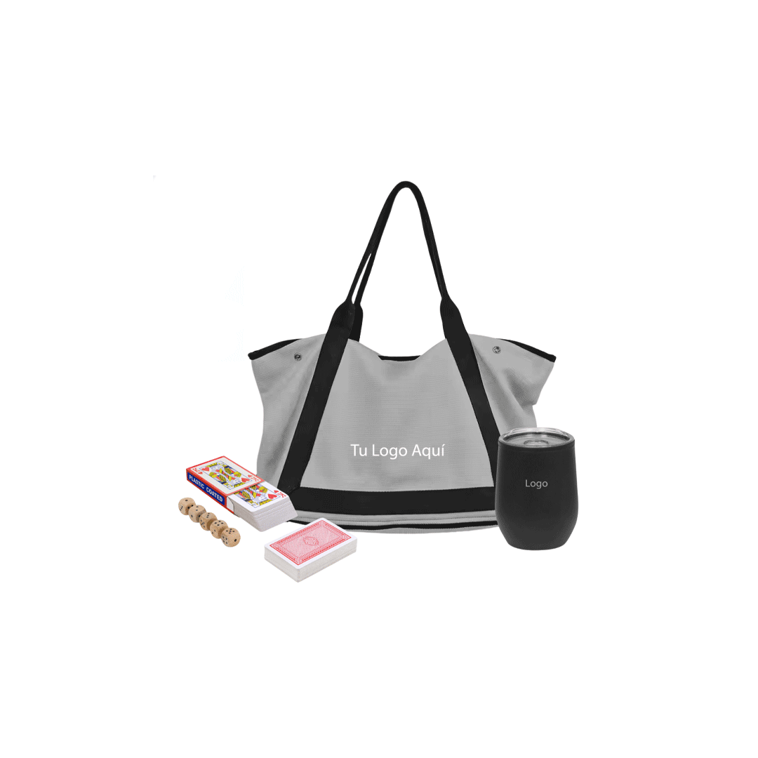 Bolso playero gris con cremallera inferior para filtrar la arena, incluye logo a un color + Mug uma, doble pared con base antideslizante y tapa transparente, capacidad 350 ml. con logo en grabado láser + Un set de juego de cartas con 5 dados, contenedor de pino y tapa deslizante con logo en grabado laser. Presentado en caja premium con cierre imantado de 32x29cm con logo a un color y cinta a elección.