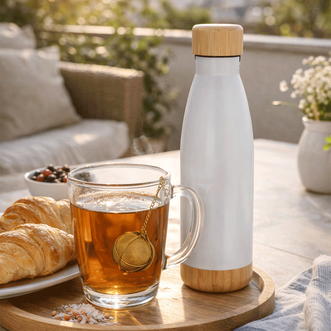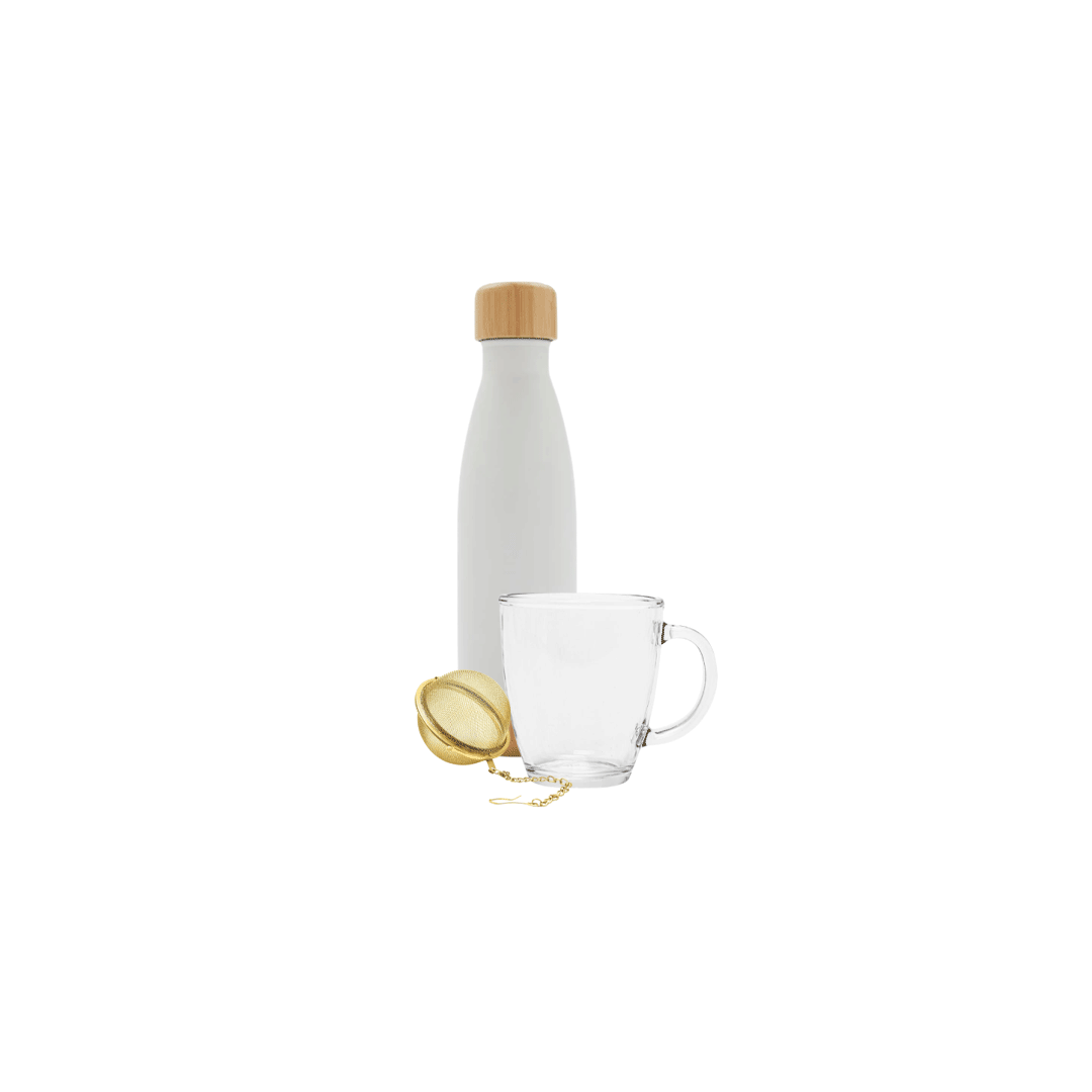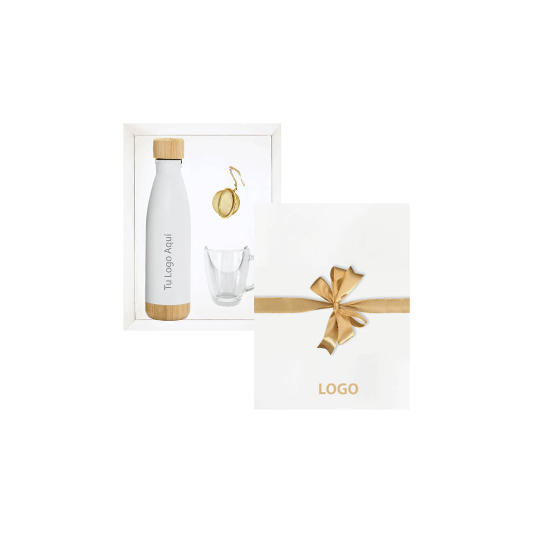 Incluye Botella térmica de doble pared de acero inoxidable y tapa de bambú, capacidad de 500 ml. Mantiene las bebidas frías por 24 hrs y calientes por 12 hrs. Logo en grabado laser + Taza de vidrio (diseño varia segun stock)+ Infusor de té esférico de acero inoxidable color dorado. Presentado en caja blanca premium imantada con encaje 34×23 cm, logo a 1 color.