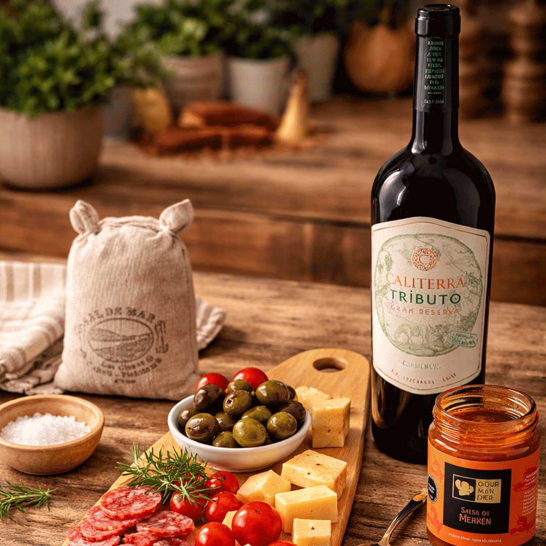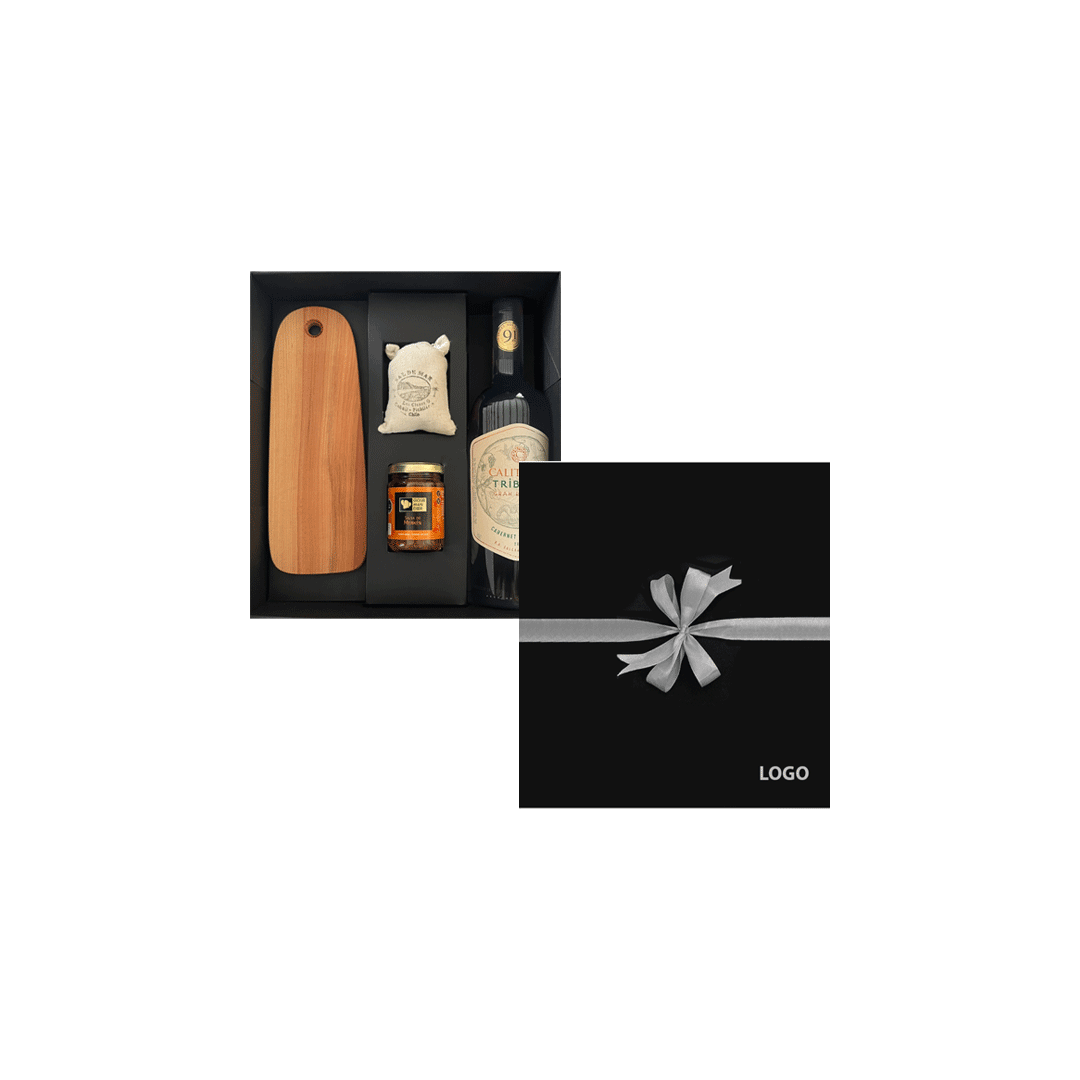 Contiene una tabla de madera raulí 28x10cm más un vino Caliterra Tributo Cabernet Sauvignon + un saco pequeño de sal de mar + un frasco de confitura de pimentón. Presentado en caja premium imantada de 32x29cm con logo a un color y cinta a elección.