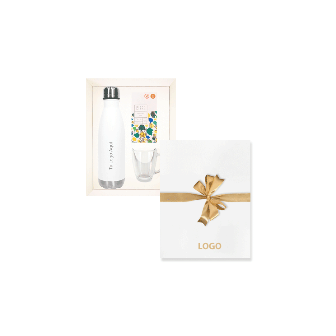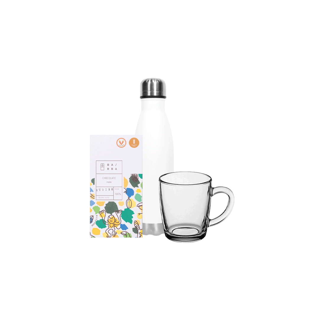 Incluye una botella termica muak, de acero inoxidable 500ml con logo grabado laser + una taza de vidrio (diseño cambia segun stock) + una barra de chocolate 100 gr con sabores a elección. Presentado en caja blanca premium imantada con encaje 34×23 cms con logo a 1 color. Puede llevar cinta de regalo.