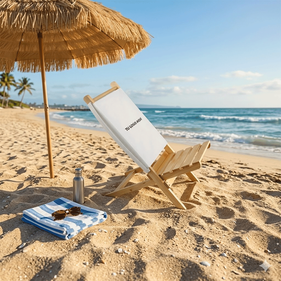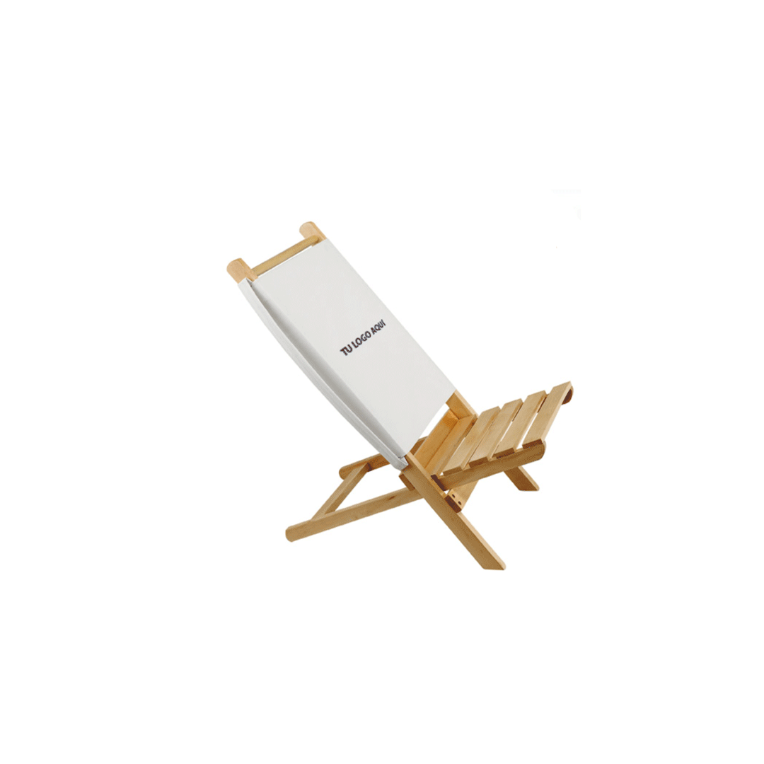 Silla arenera de playa de madera de pino cepillado con lona puede ser en blanca, azul y roja con grafica de cliente a full color. Incluye correa de algodón para transportarla liviano, plegable y fácil de llevar. Presentado en bolsa crea 50×96 cms con grafica corporativa a 1 color.