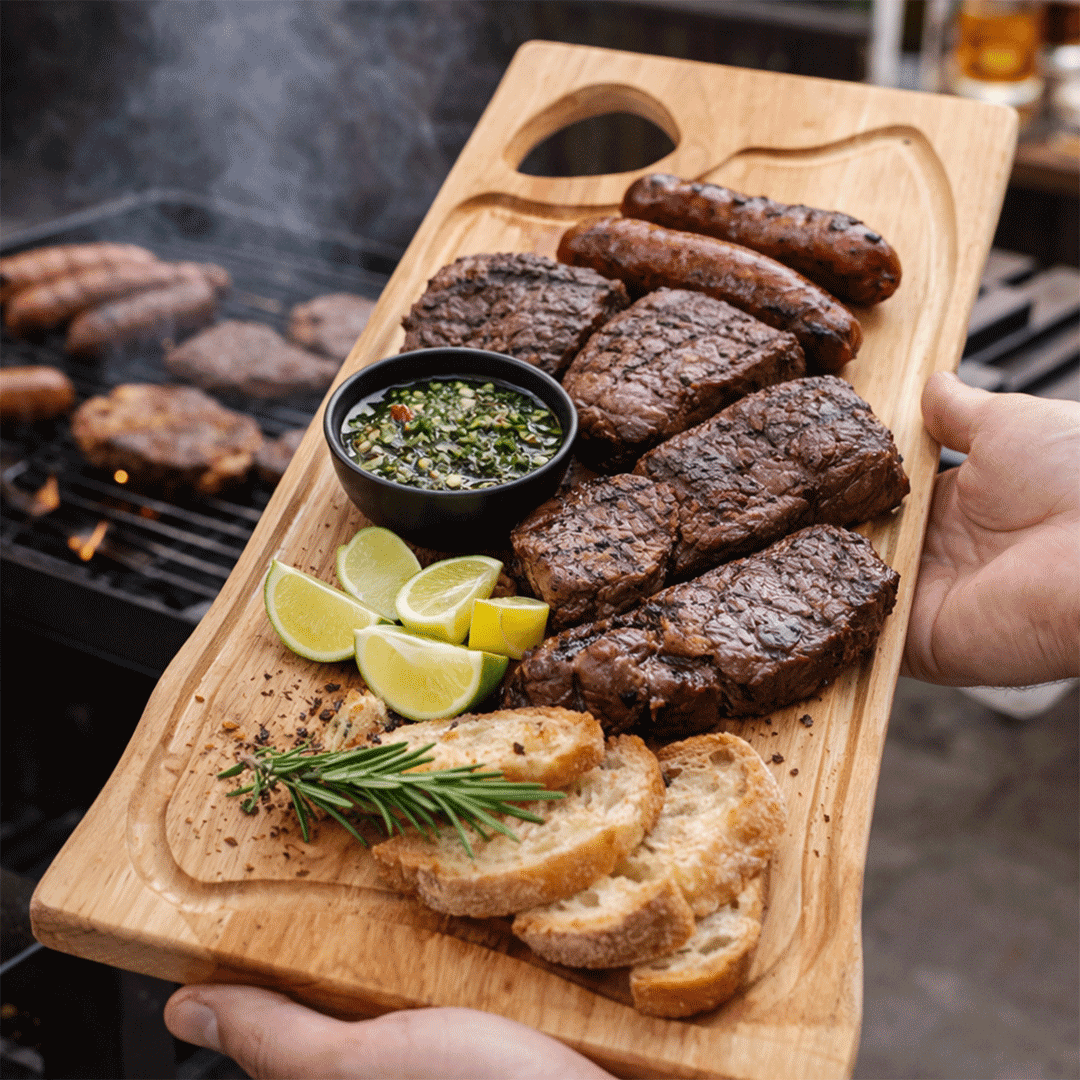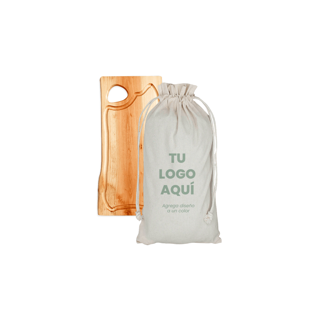 Tabla 50 cms aprox madera rustica de raulí con aplicación logo grabado en tabla. Presentado en bolsa crea 69×36 cms con grafica corporativa a 1 color.