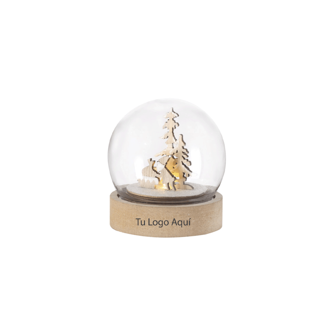 Bola iluminada con original diseño navideño. Elaborada en resistente material acrílico, con base de madera lisa para impresión. Dispone de iluminación interior con 1 LED en tono blanco. Alimentación por 3 pilas de botón, incluidas, con botón ON/OFF en la base. Diámetro: 7.9 cm, alto: 8.5 cm. logo a un color en madera. Presentado en caja kraft, envuelta en papel con cinta de regalo y tarjeta de saludo.