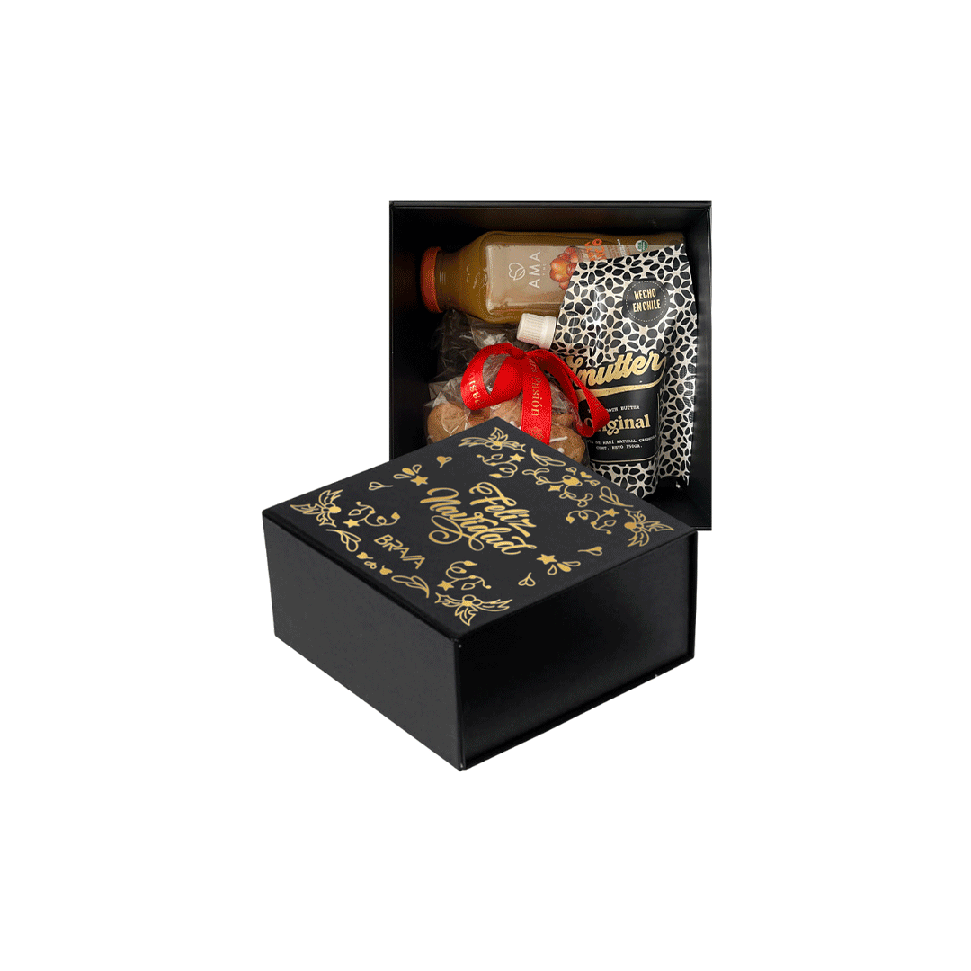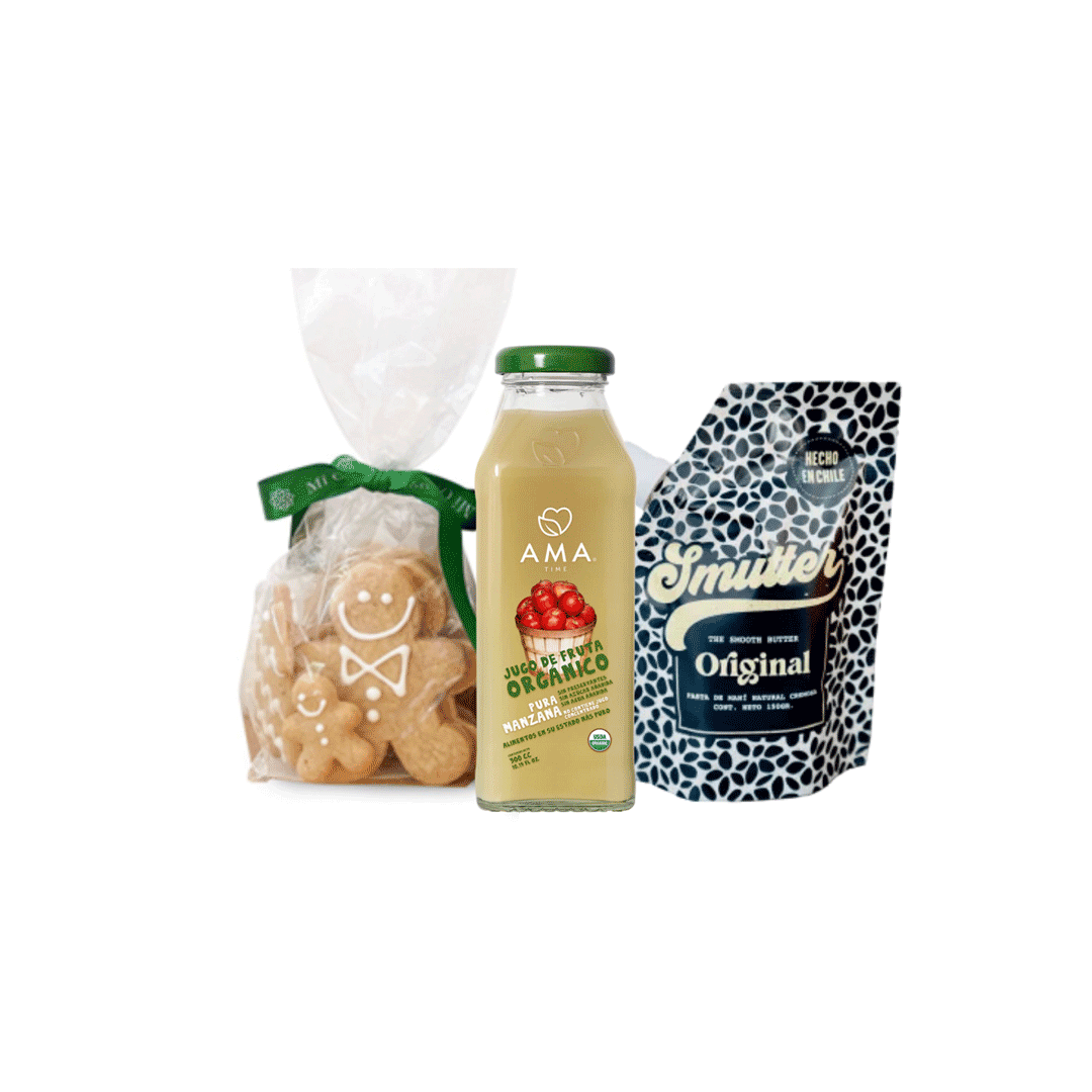Contiene una Mantequilla de Maní Original 150 gr + Jugo Ama orgánico 300 cc sabores variados según stock + Galletas de jengibre pintadas a mano 150gr . Presentado en caja premium negra de 16x16cm con logo y/o gráfica a un color.