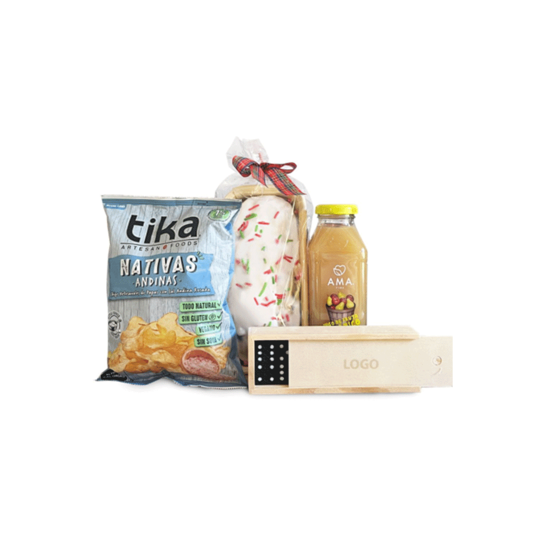 Contiene un Pan de Pascua de 400 gr decorado navideño + Chips artesanales nativas Tika 35 gr + Jugo Ama 300 cc + Juego Dominó, ideal para jugar en familia. Cuenta con 28 fichas negras MDF, bajo relieve con puntos blancos, en una caja de madera de 15x3x5cm tapa es desplegable con logo en grabado laser. Presentado en caja premium de 25,5x20cm con logo y/o gráfica a un color y cinta a elección.