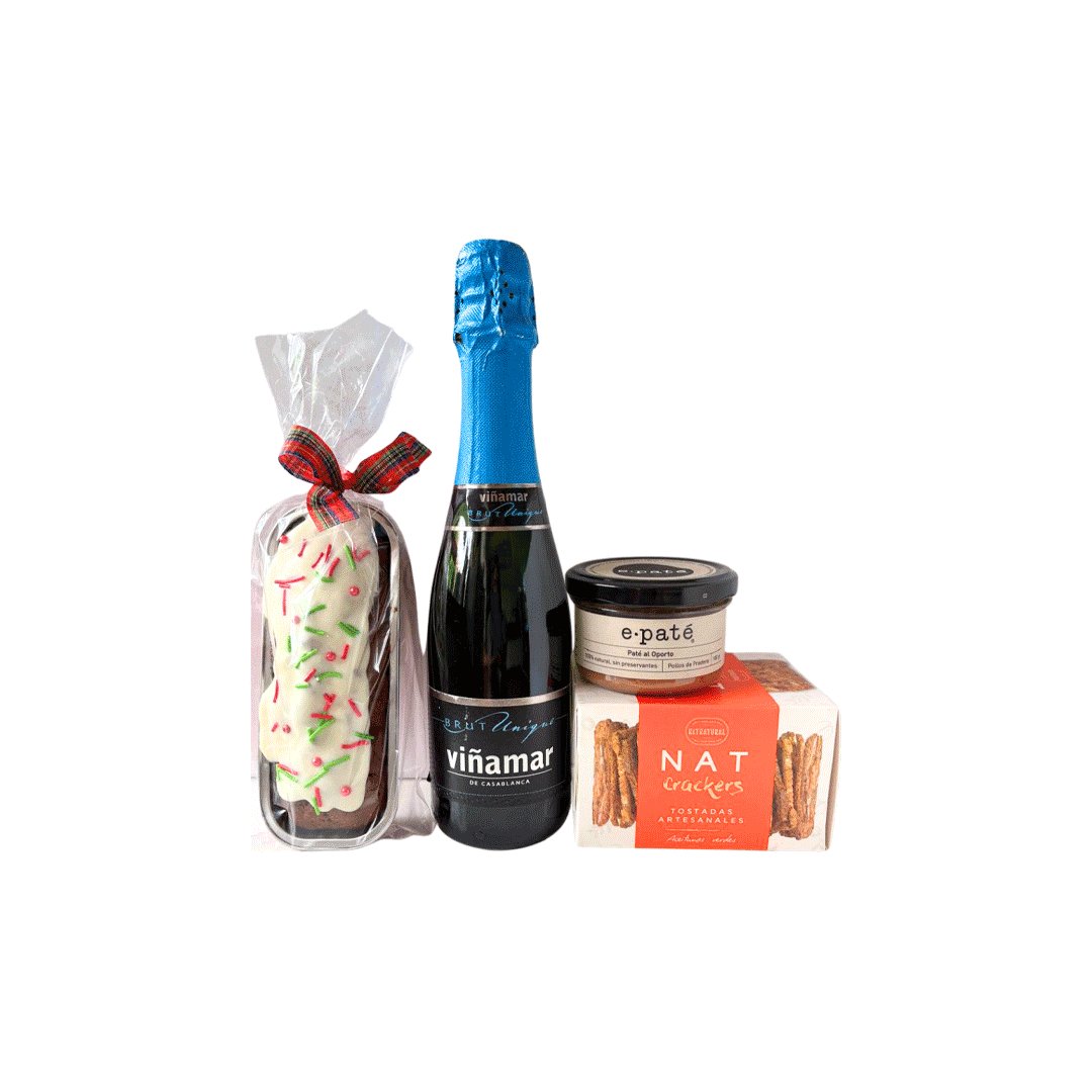 Contiene un Espumante Brut Viñamar Unique 375cc + Crackers Nat 80 gr sabores según stock + Paté natural E-pate 100gr sabores según stock + Pan de pascua decorado de 160gr. Presentado en caja premium de 25,5x20cm con gráfica y/o logo a un color.