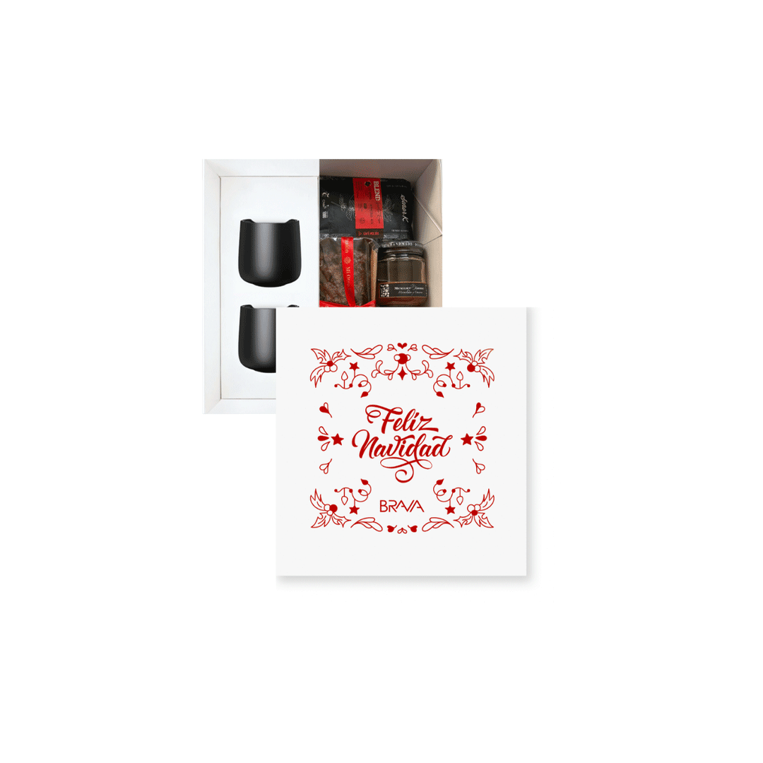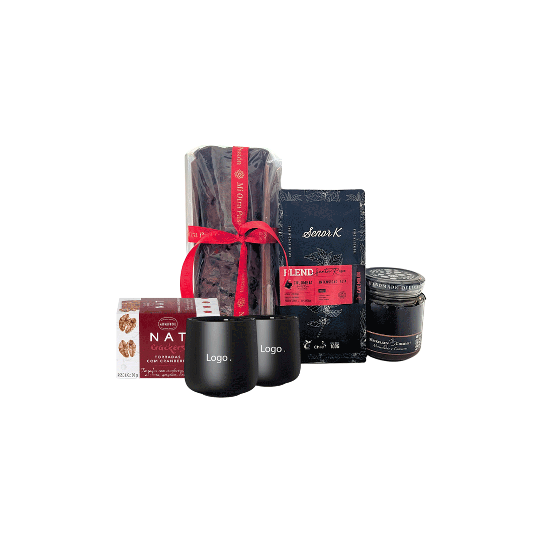 Contiene 2 tazas de cerámica terminación matte, doble pared 150 ml con logo en ambas tazas + Pan de pascua 800 gr Mi otra pasión + Café señor K Blend 100 gr + Crackers Nat 80gr sabores según stock + Mermelada Mickelesen 280 gr. Presentado en caja premium blanca de 32x29cm, con logo a un color y cinta a elección.