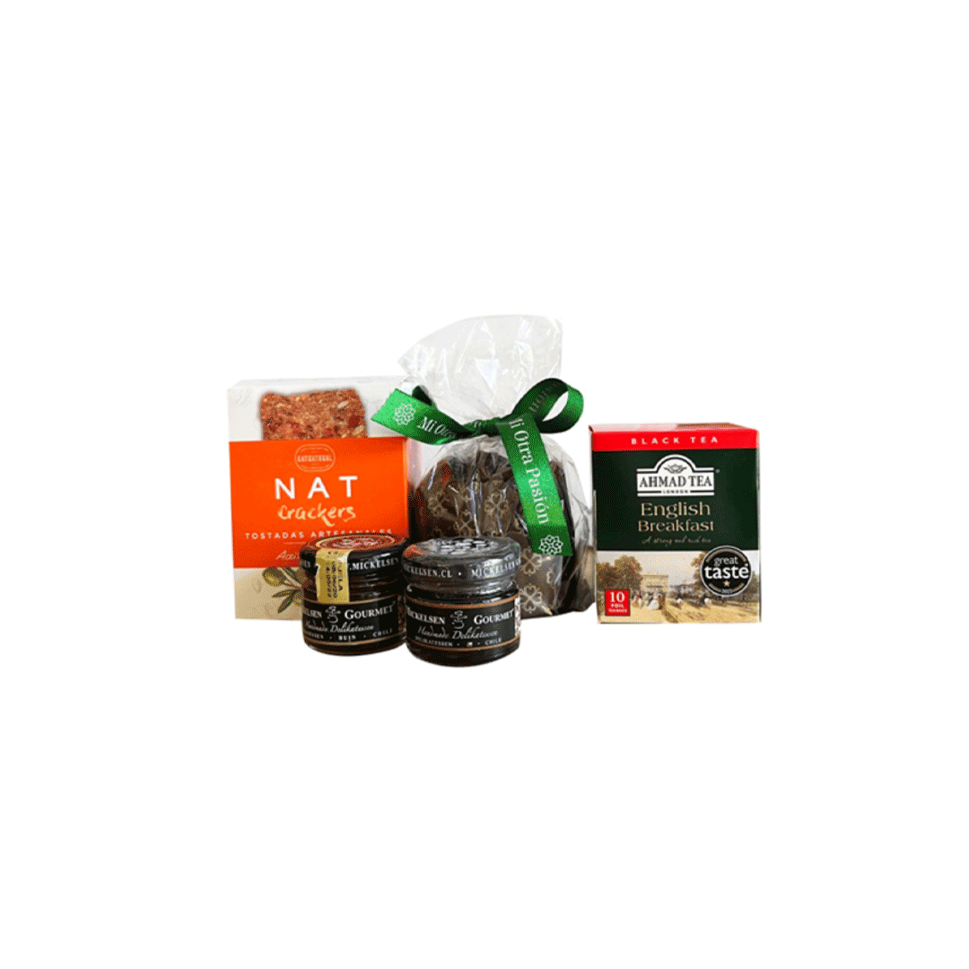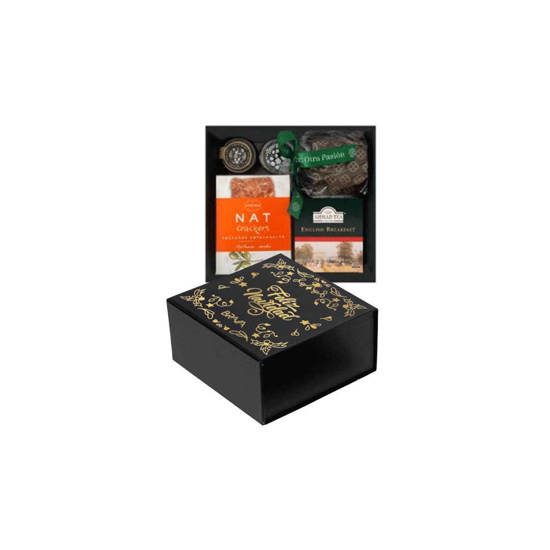 Contiene Pan de pascua 140 gr + 2 mini Mermelada sabores surtidos Mickelsen 25 gr + Galletas Nat artesanales 80 gr sabores surtidos según stock + Caja con 10 sobres de té según stock, Ahmad Tea. Presentado en caja negra premium de 16x16cm logo y/o gráfica a un color, cinta a elección.
