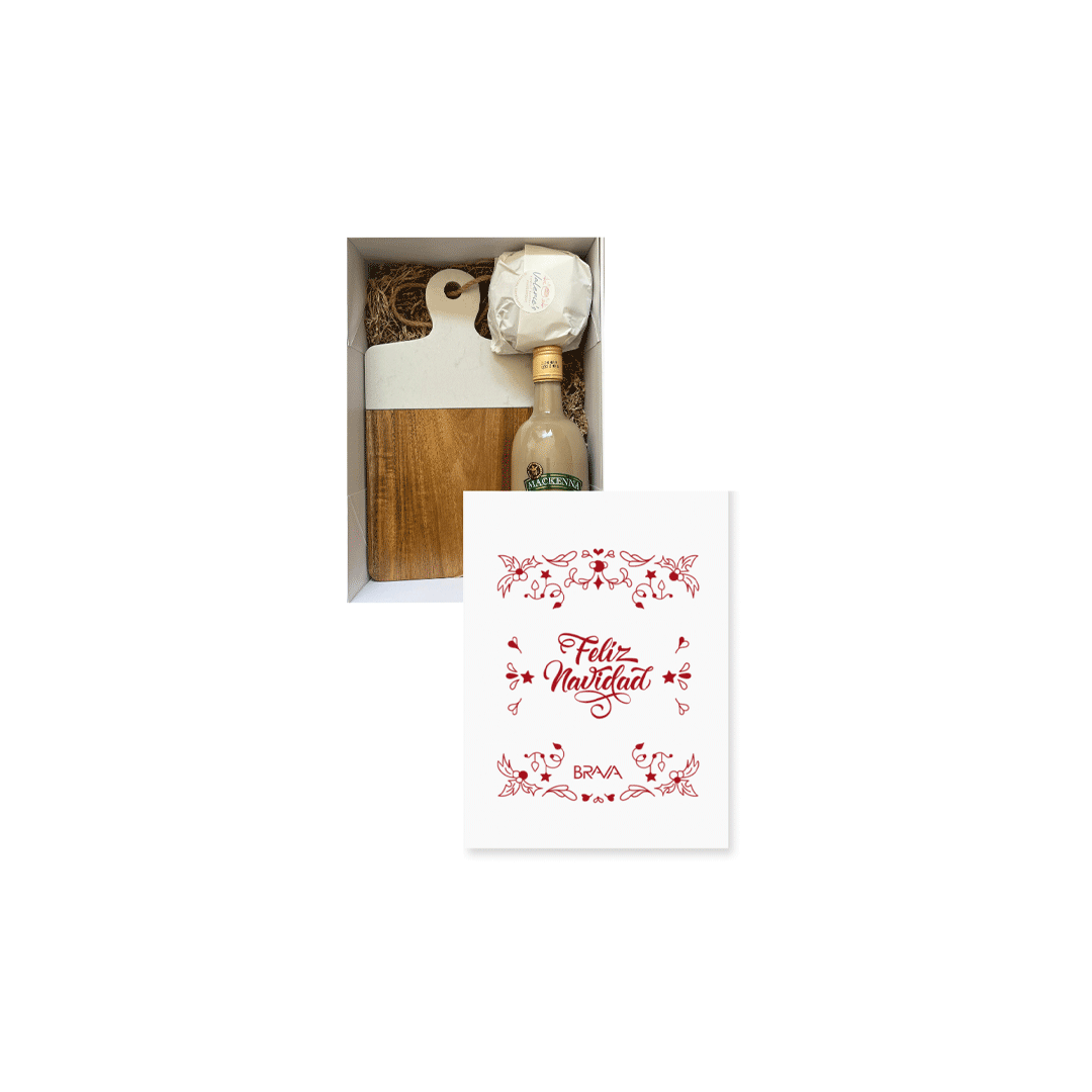 Box contiene cola de mono 645 cc Mackenna + Pan de pascua Valerie’s 250gr + Tabla de madera y mármol reconstituido en color blanco, tamaño 33x19cm, con logo a un color en madera . Presentado en caja premium imantada de 34x23cm con logo y/o gráfica a un color, cinta a elección.
