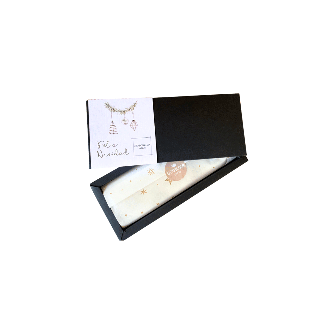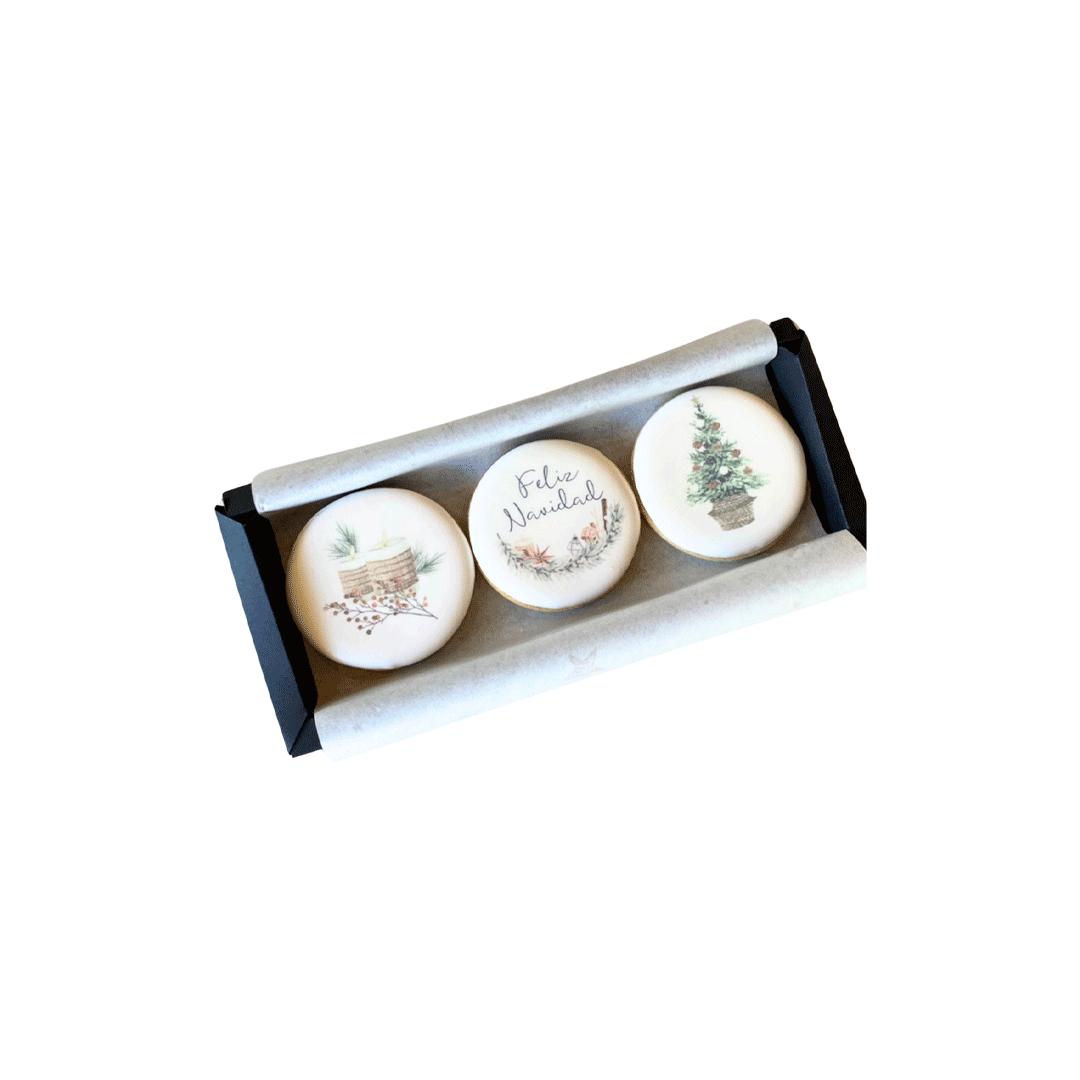 Cada caja contiene 3 galletas de 6 cm de diámetro aprox. diseños navideños y logo de cliente. Presentado en caja negra con funda personalizada con logo de cliente.