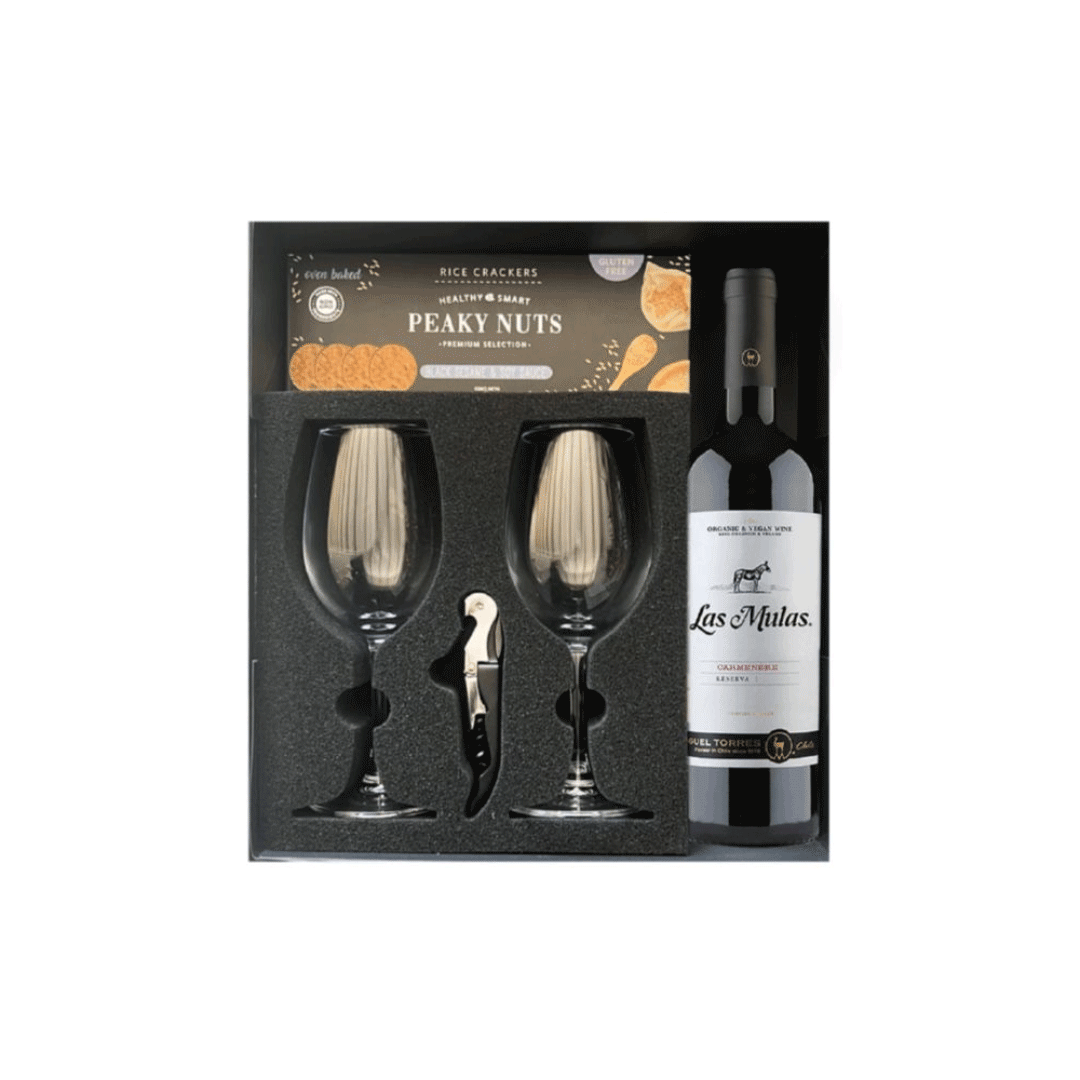 Set de 2 copas para vino y sacacorchos de acero inoxidable con acabado negro mate más un vino las Mulas y una caja de rice crackers 100gr. Presentado en caja negra 32×29 cms con logo y cinta a un color.
