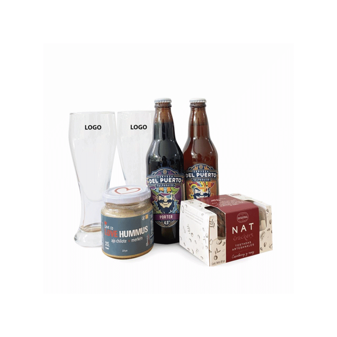 Contiene dos cervezas artesanales del puerto poter y pale ale más 2 vasos de vidrio cerveceros con logo incluido, unas crackers artesanales 80gr y un hummus 220gr sabores según stock. Presentado en caja 34x23cm premium con logo a un color y cinta a elección.