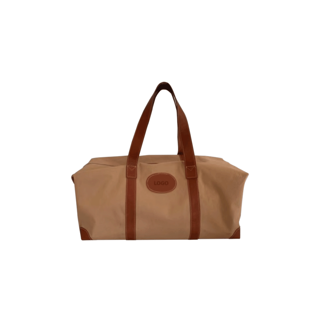 Bolso tela raquelada con aplicación de cuero. Incluye 1 bolsillo interior, cierre plástico y broches metálicos, forro interior seda. Medidas: 56 x 39 x 26 cms con aplicación de logo en cuño. Presentado en caja kraft negra con logo a 1 color.