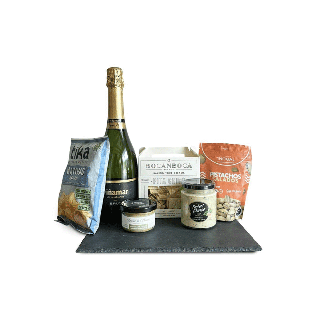 Contiene Champaña Viñamar Brut + Galletas Bocanboca 120 gr pita chips sabores surtidos + Dip perfect choice 220 gr + Tapanade de aceitunas verdes Helene 90 gr + Mix de pistachos salados Tnogal 80 gr + Tabla pizarra 30 x 19,5 cms aprox. Presentado en caja negra 32×29 cms con logo a 1 color. Puede llevar cinta de regalo color a elección según stock.