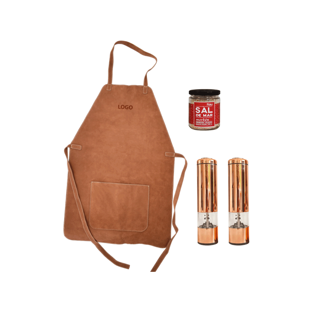 Set incluye dos especieros eléctricos cobrizados, con logo a un color en ambos productos, funciona con 4 pilas AA (no incluye). + Una sal Nau de 400gr sabores según stock + Pechera de reno con bolsillo con logo grabado. Presentado en caja premium imantada negra de 32x29cm con logo a un color y cinta a elección.