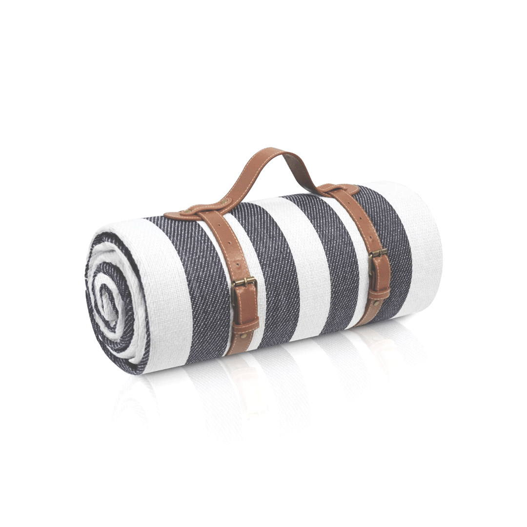 Manta de picnic rayada gris con blanco, es impermeable, ligera y con mango de ecocuero. Fabricada con 3 capas de material laminadas juntas que cumplen diferentes propósitos. Sin separación entre capas, acabado firme y suave. capas inferiores de Peva impermeables, segunda capa, acolchado de espuma para mayor comodidad y tercera capa, tela de poliéster suave y fácil de limpiar.