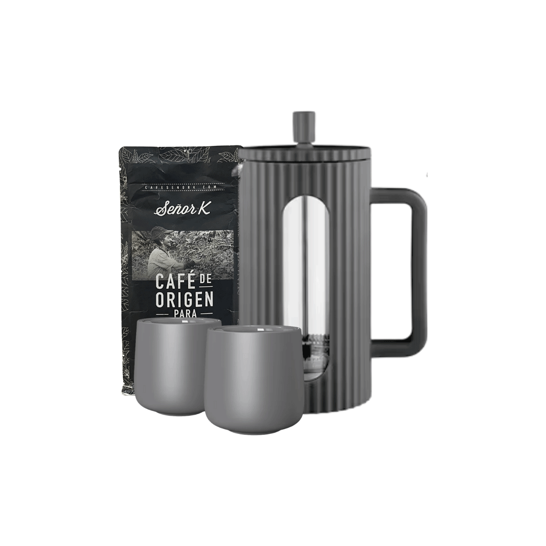Cafetera francesa gris 600ml con diseño de rayas verticales con logo a un color + 2 tazas grises doble pared 150 ml (elección de color según stock; negro, gris y beige). + Café molido señor k de 100 gr blend.
