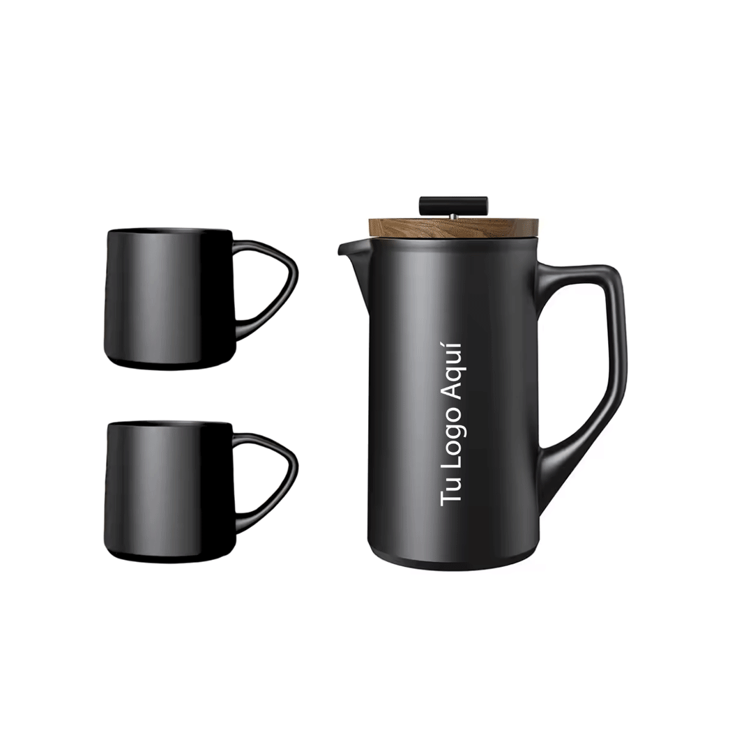 Cuerpo de cerámica de alta temperatura, preserva el sabor del café y prolonga el tiempo óptimo de consumo, tapa de madera de nogal natural, acero inoxidable 304 de grado alimenticio. Exterior mate, interior brillante. Capacidad cafetera: 600 ml. Capacidad tazas: 90ml. Incluye logo en cafetera. Presentado en caja premium negra con encajes, incluye logo a un color y cinta a elección.
