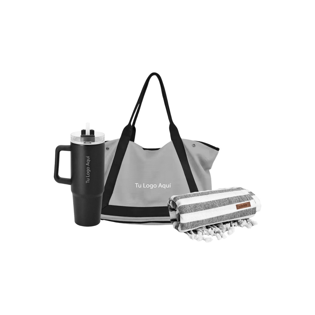 Bolso playero gris con cremallera inferior para filtrar la arena, incluye logo a un color + Mug mega, doble pared con sorbete plastico. Interior de plástico y exterior de acero, capacidad 880 ml. logo en grabado láser + Toalla turca con colores y diseños a elección segun stock, medida 1 x 1.80m, logo en etiqueta de eco cuero. Presentado en caja premium con cierre imantado de 32x29cm con logo a un color y cinta a elección.