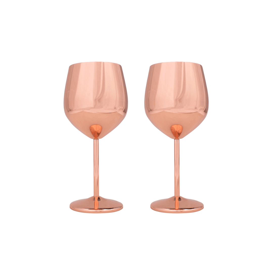Dos copa de Acero inoxidable 304 SS de 0.6mm de espesor, con superficie lisa en color encobrizado. Producto BPA FREE, para el contacto con líquidos y alimentos, incluye logo en ambas copas. Capacidad 500ml. Presentado en caja premium de 25,5x20cm con cierre magnético, logo a un color y cinta a elección.
