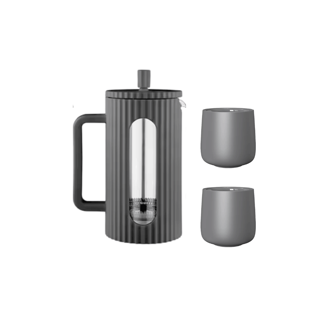 Cafetera francesa gris 600ml con diseño de rayas verticales con logo a un color + 2 tazas grises doble pared 150 ml (elección de color según stock; negro, gris y beige). Presentado en caja premium 30x14cm blanca o negra, con logo a un color y cinta a elección.