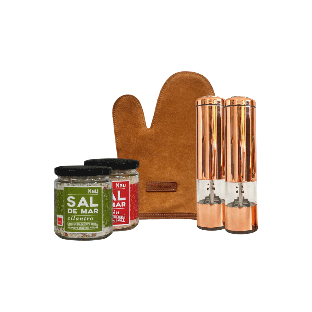 Set incluye dos especieros eléctricos cobrizados, con logo a un color en ambos productos, funciona con 4 pilas AA (no incluye). + Dos sales Nau de 400gr sabores segun stock + Guante de reno para parrilla con logo en etiqueta de eco cuero. Presentado en caja premium negra imantada de 32x29cm con logo a un color y cinta a elección.