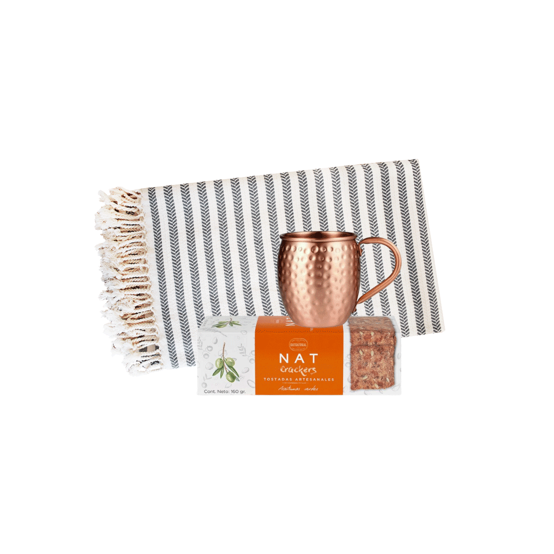 Una toalla turca individual con colores y diseños a elección segun stock disponible, medida 1 x 1.80m, con logo en etiqueta de eco cuero + Un mug 100% cobre terminación martillada creado a mano, incluye logo en grabado laser en la base + Cracker artesanales de 160gr con sabores variados segun stock.Presentado en caja premium con cierre imantado de 32x29cm con logo a un color y cinta a elección.