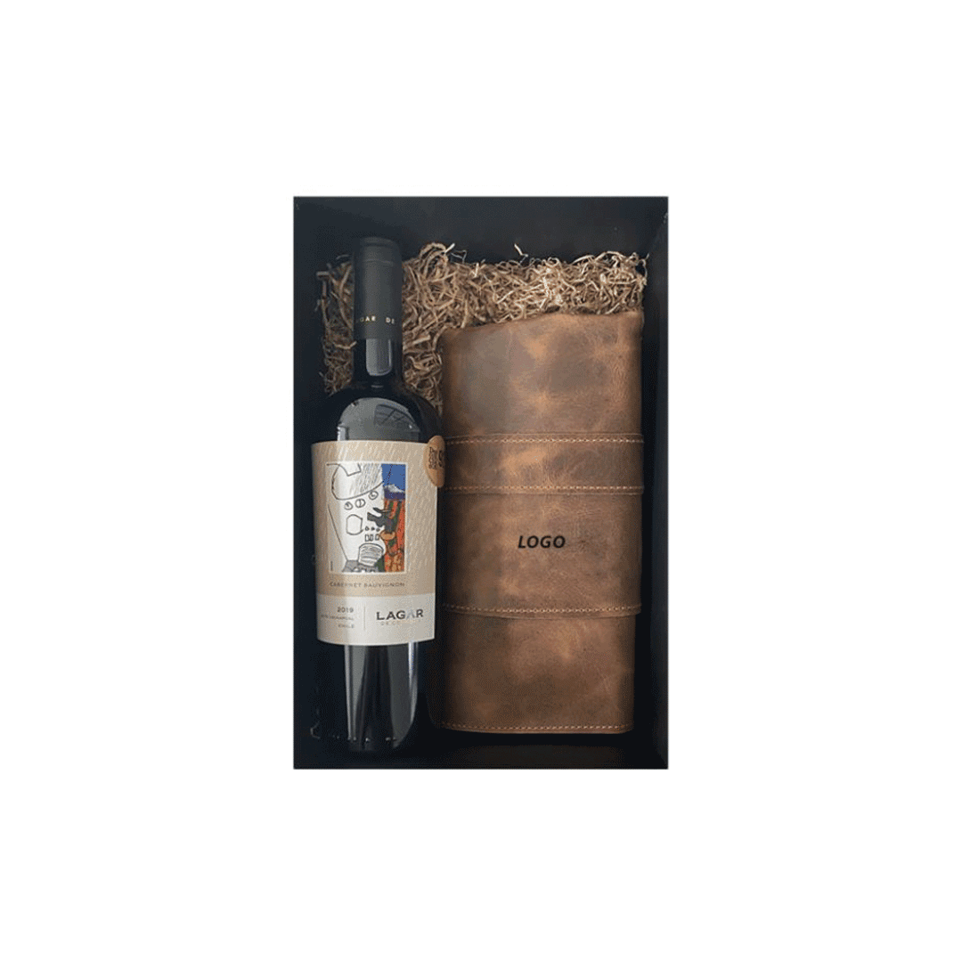 Un vino Lagar cabernet Sauvignon junto con una funda notebook 100% artesanal de cuero, con logo en funda en cuño. Disponible para tres medidas: 13″ (alto 25,5cm y largo 33,5cm), 15″ (alto 27,5CM y largo36,5cm) y 16” (alto 29 cm x largo 40,5 cms). Presentado en caja premium de 34x23cm, con logo a un color y cinta a elección.