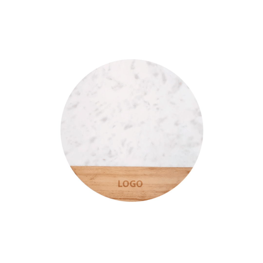 Tabla redonda de mármol blanco y madera con logo a un color, tamaño de 28 cm de diámetro. Presentado en caja premium de 32x29cm con logo a un color y cinta a elección.