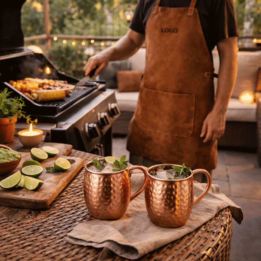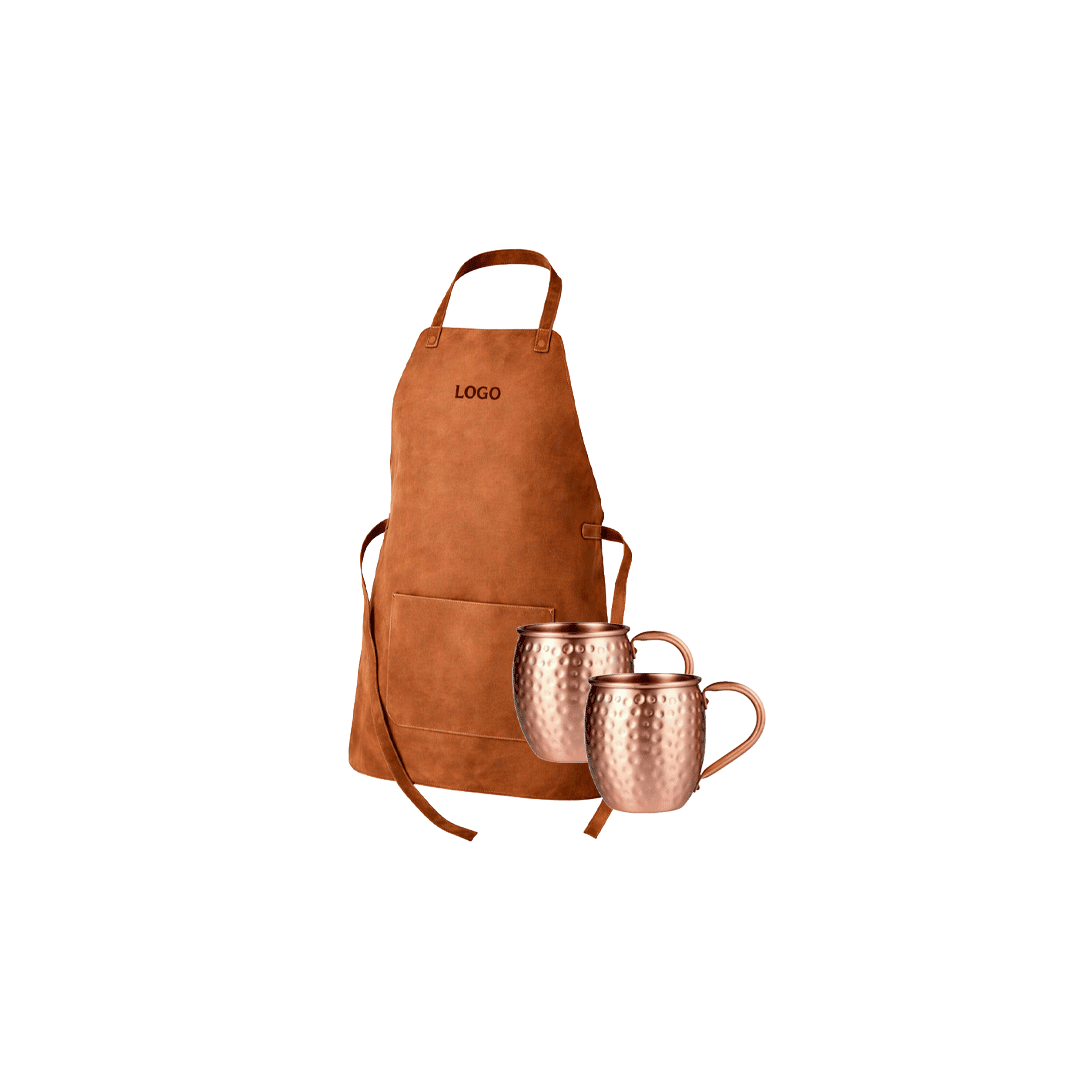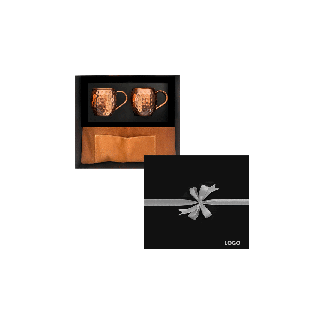 Set de dos mug 100% cobre estilo martillado, con logo grabado en base de ambos mug + pechera de reno con bolsillo puede llevar logo a 1 color. Presentado en caja premium imantada con encajes, de 32x29cm, con logo a un color y cinta a elección.